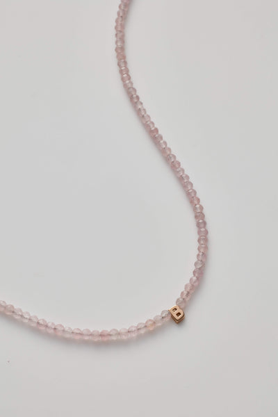 Hand-strung rose quartz necklace is accented with a solid gold letter charm. Rose quartz opens the heart, promotes self-love, and fosters emotional healing.