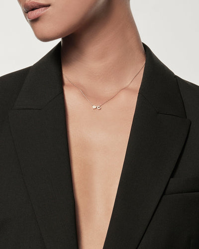 Close-up of a woman wearing a minimalist 18k gold initial "C" and gold heart charm  on a fine chain, styled with a black blazer – personalised alphabet pendant jewellery