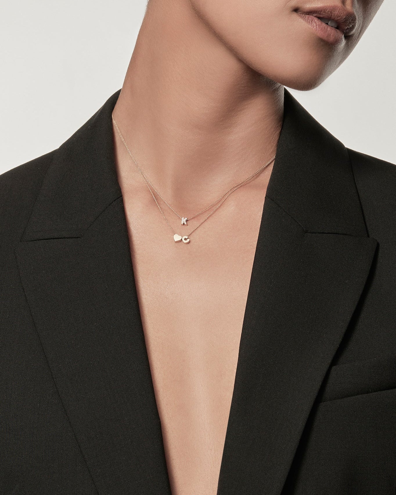 Close-up of a woman wearing a minimalist 18k gold initial "C" and gold heart charm  on a fine chain, layered with a diamond letter "K" necklace, styled with a black blazer – personalised alphabet pendant jewellery